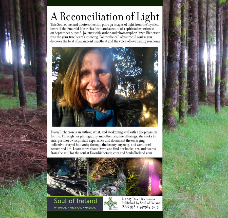 On the morning of September 9, 2016, I set out in the Irish fog and rain, guided by my soul to participate in what I was shown to be a “Reconciliation of Light.” That day I returned to the same sacred wood where some of my favorite photographs of light breaking through were taken during my year living in County Roscommon, Ireland. These 72 original images in a unique Soul of Ireland photography book explore the theme of the play of light in the heart of the Emerald Isle. Makes a great gift for anyone who loves spiritual travel and experience and magical, mythical, mystical Ireland.