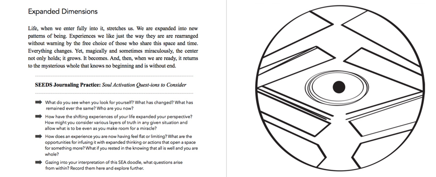 Gaze into each SEA symbol. Consider soul-activating questions using SEEDS Journaling practice {SEEDS stands for Soulful Exploration for the Essential Discovery of the Self} to connect you to the questions alive in you and prepare you for the movement of life energy associated with this SEA symbol. Then, comes the fun part. Add color and your original soul doodles along with essential notes of what arises. Use this coloring book to connect more deeply with your soul’s knowing and intuition as you explore life movements and topics that have to do with living in full expression. We begin within, exploring from the inside out patterns of potentiality revealed within whole worlds of wonder emanating from the heart and soul of who we are and reflected in the world around us.